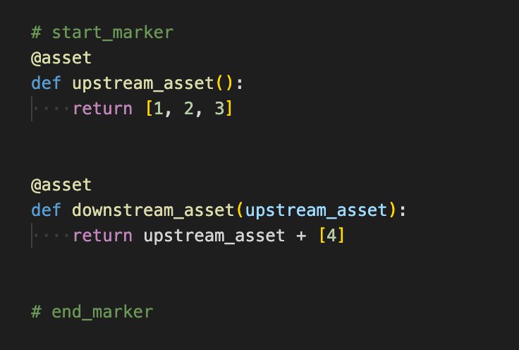 You can find the corresponding Python file at dagster/examples/docs_snippets/docs_snippets/concepts/asset/asset_dependenyy.py. The code included in each snippet is the code in the file between the # start_marker and # end_marker comments.
